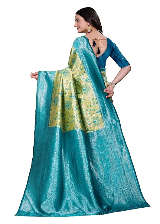 Featuring a refreshing Lemon Yellow body, this saree is adorned with intricate Silver Zari woven peacock and floral motifs, giving it a rich and graceful appearance.