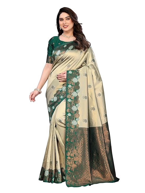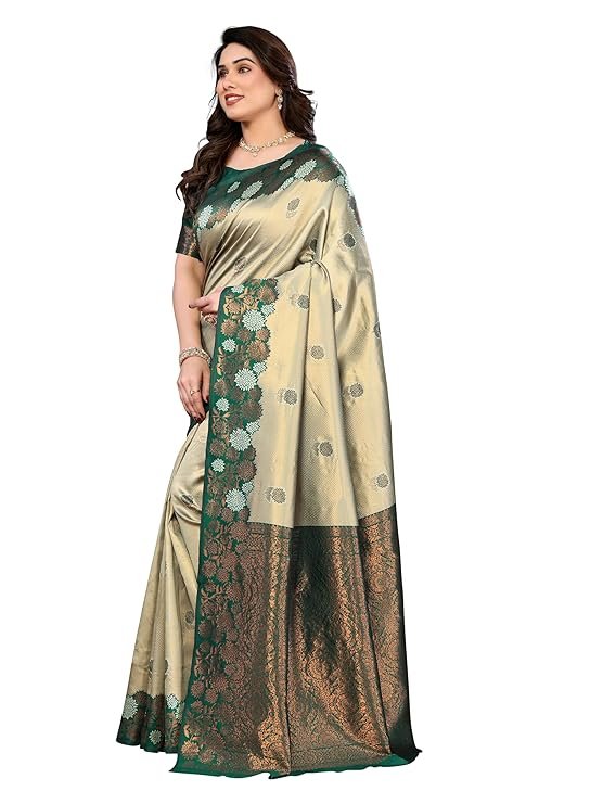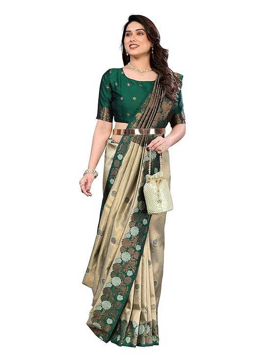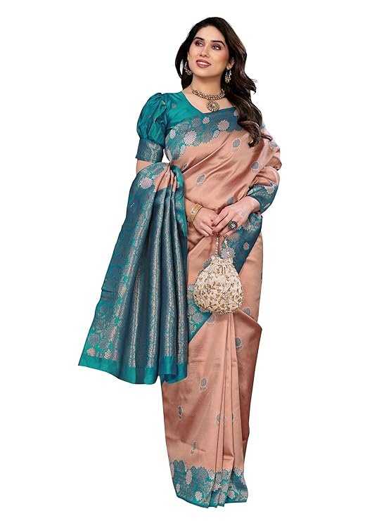 Made from a high-quality jacquard silk blend, this saree features full-body copper zari woven work that enhances its richness and luxurious appeal.